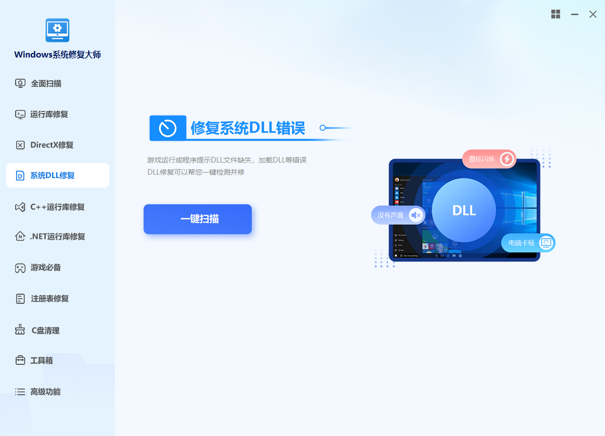 自动扫描并修复系统缺失的dll文件,解决系统更新异常、电脑无故闪退崩溃、黑屏蓝屏等